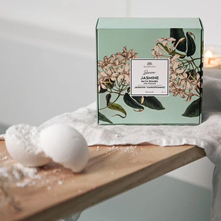 En presentask med 4 badbomber. Magradas sprakande badbomber skapar en lyxig stämning i ditt badrum, lockande med sina kraftfulla ingredienser och den förtrollande verklighetstrogna piondoften. Oavsett om du väljer den sött lockande jasminen eller den sommarliga, busiga pionen, är mjuk och återfuktad hud garanterad. Badbomberna innehåller naturliga avokado- och solrosoljor samt vitamin E, som tillsammans vårdar, återställer och mjukgör din hud när du tar ett bad. Den behagligt diskreta blomdoften lugnar både kropp och sinne, slappnar av och lyfter humöret, och tar dig till den vackraste sommardagen.